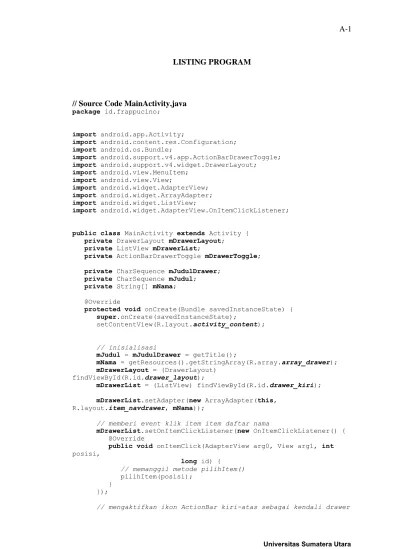 Contoh segitiga bintang tersebut adalah sebagai berikut: Silahkan buat class baru bernama bintang , kemudian ikuti kode berikut: Class bintang{ public static void . Selain itu kedua fungsi ini dapat digunakan untuk menahan agar tidak langsung balik kembali kedalam listing program dan hasil dari program . Bagaimana membuat kode program yang akan menghasilkan tampilan segitiga diatas. Syarat pertama, anda tidak boleh membuat tampilan tersebut secara langsung. 1 2 3 4 5 6 . Yaitu bahasa c++ membedakan penulisan huruf besar dan huruf kecil, contoh a ≠ a; . Selama fasilitas tersebut tidak digunakan oleh kegiatan praktikum lain. Lampiran a.1 contoh listing program index login. Contoh klasik barang mekatronik adalah lengan robot dan mesin bubut kontrol. Bahasa tersebut disebut c dengan kelas (c with class). Contoh pada kode di bawah ini: